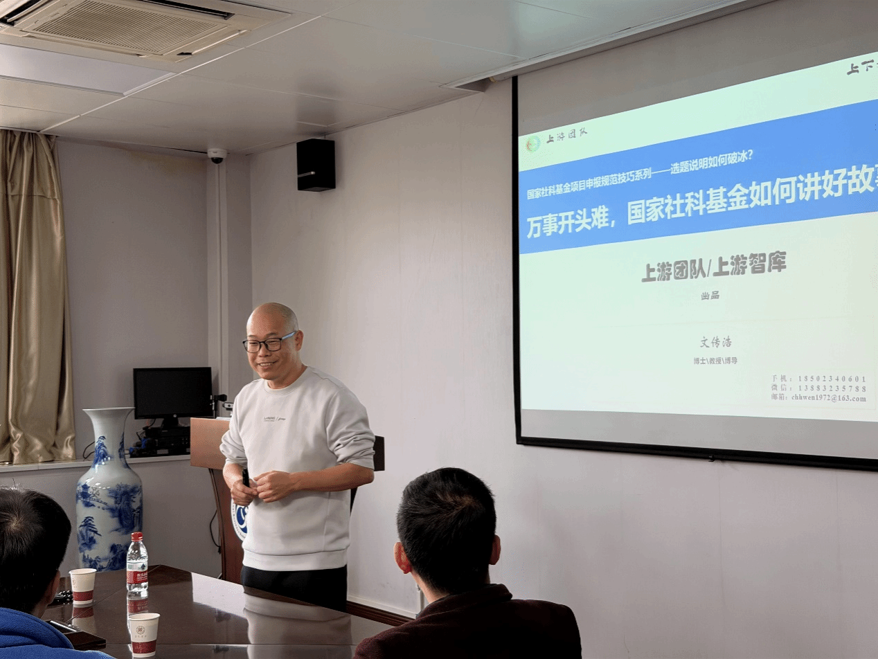 2025年10月31日,我院在长安校区文澜楼1329报告厅举办了“万事开头难,国家社科基金如何讲好故事开头”的基金申报辅导。辅导特邀云南大学生态经济学二级教授、“上游智库”首席专家文传浩教授主讲。学校社科处、学院拟申报国家社科和国家自科基金的老师及部分研究生等50余人参加了本次辅导,学院副院长杨博主持本次辅导。