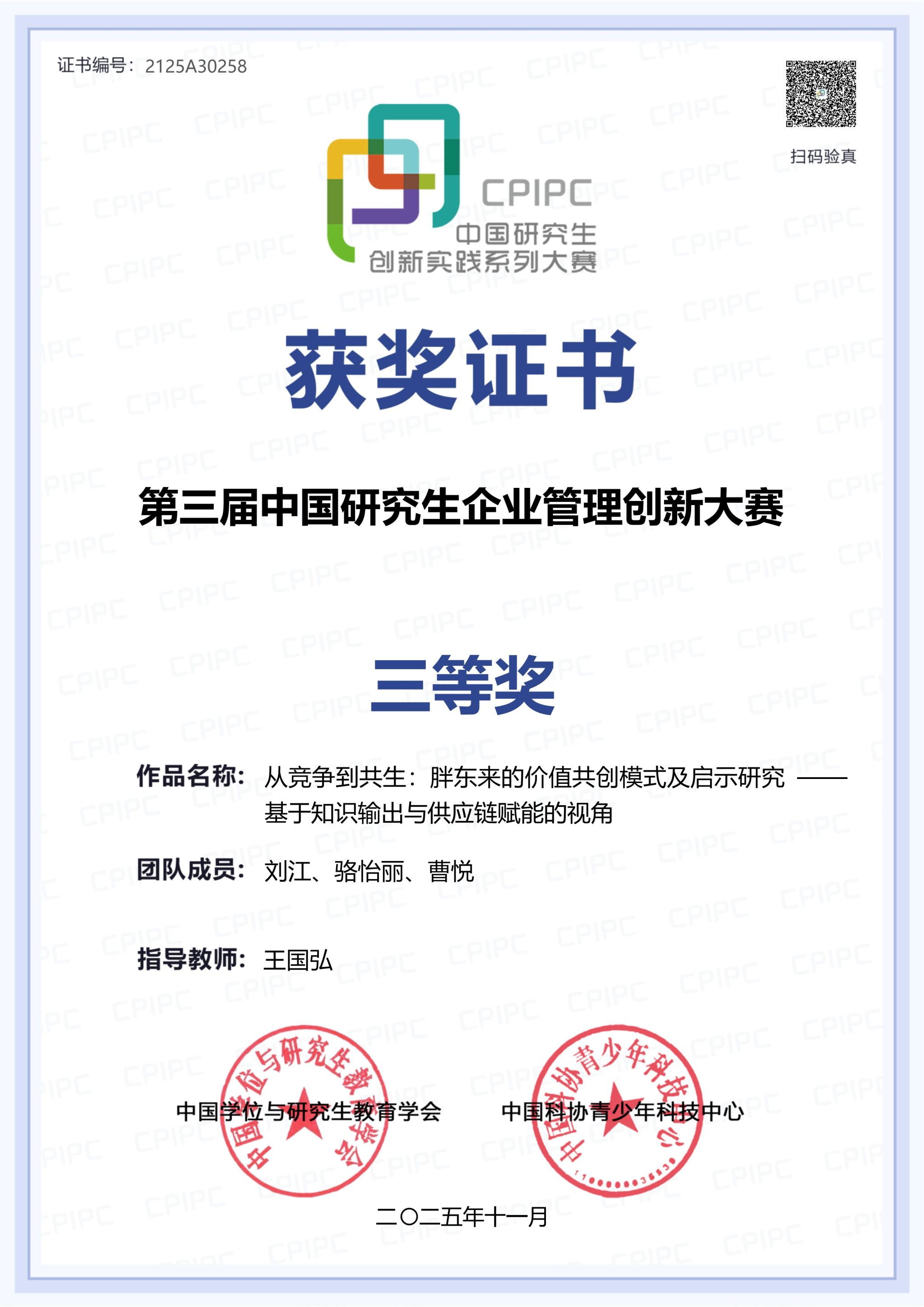 近日,第三届(2025)中国研究生企业管理创新大赛全国总决赛圆满收官,由我院教师王国弘指导,2025级MBA研究生刘江、骆怡丽、曹悦组成的“联创金兰”团队在工商管理案例赛道斩获全国三等奖,成为我校在该全国性赛事中的首支获奖队伍,刷新了最好成绩。