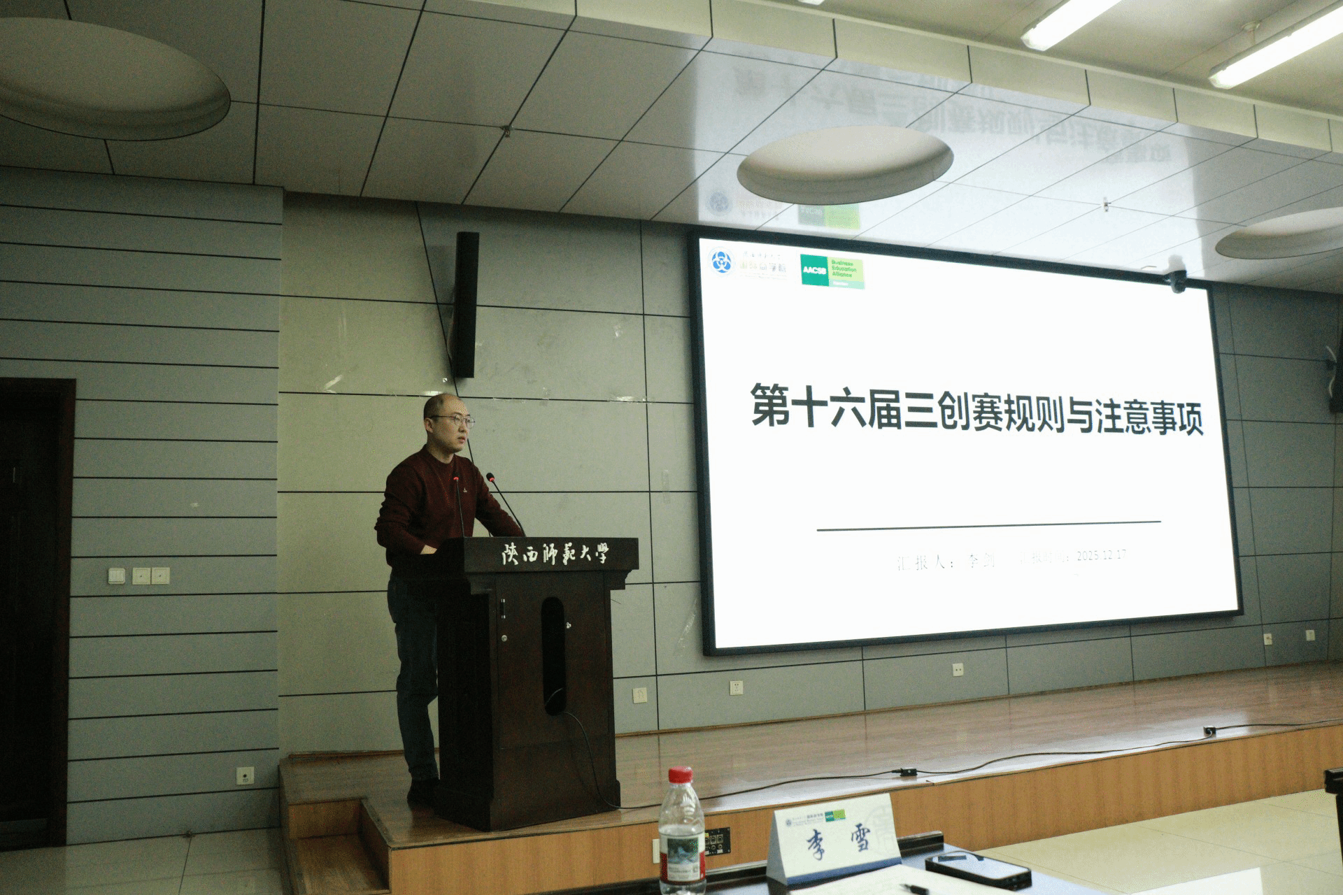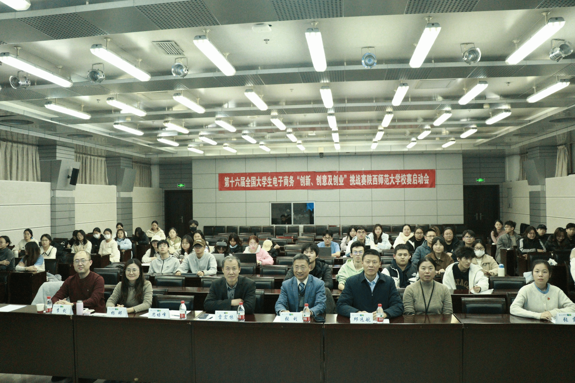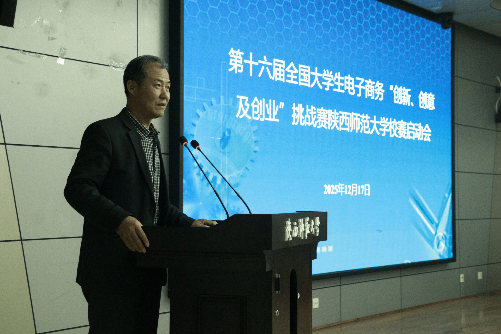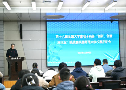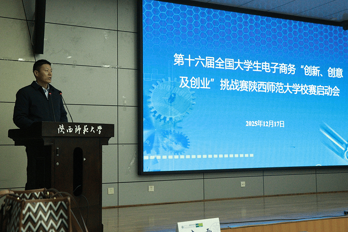 2025年12月17日,第十六届全国大学生电子商务“创新、创意及创业”挑战赛(简称“三创赛”)陕西师范大学赛区启动仪式在长安校区图书馆西附楼一层报告厅隆重举行,本次活动由学校教务处主办、国际商学院承办。本次启动仪式的举办标志着新一届“三创”竞赛的全面启动,为全校师生的创新创业实践拉开序幕。第十六届“三创赛”秘书长张利教授、国际商学院党委书记思培峰、院长雷宏振、副书记邱远航、副院长尹海员等嘉宾,校内多个院系的师生参加。
