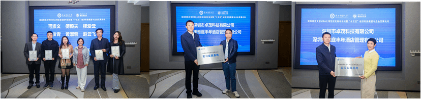 主题演讲之后,为校友导师聘任与实践基地授牌环节,张淑惠副院长首先为六位优秀校友颁发企业导师聘书,聘请他们助力学院MBA学子的实践能力培养与职业发展规划;邱远航副书记为两家企业实践基地授牌,为学院搭建了更多优质的实践教学平台。